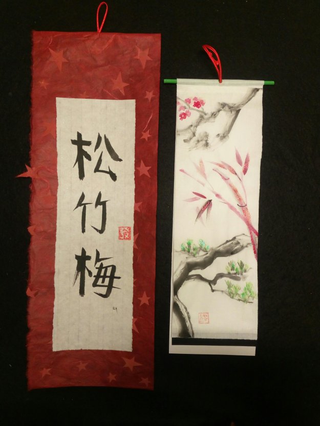 El deseo de un feliz año nuevo se acompaña en algunas casas de Japón colgando en sus casas unos kanjis y pinturas donde están representados el bambú, ciruelo y el pino.